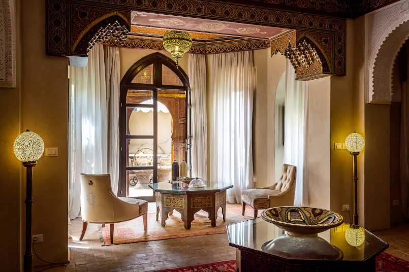 Le Palais Khum, riad de luxe à Marrakech, a été restauré dans la pure tradition locale, offrant un véritable voyage architectural où se mêlent différentes influences culturelles et historiques.